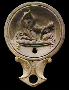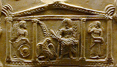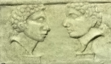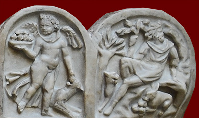 Selene and Endymion, this time in a scene later than that on the body of the sarcophagus, as the goddess lovingly clasps Endymion's face and leans forward to kiss him (note that his eyes are closed in sleep).