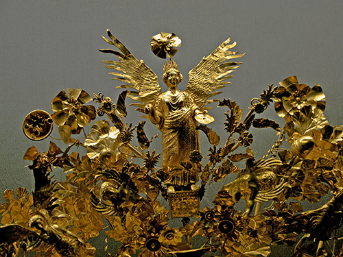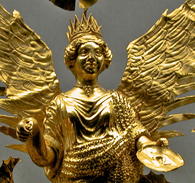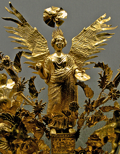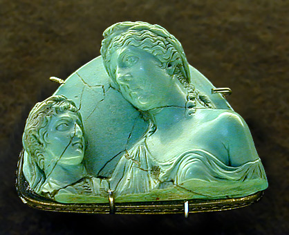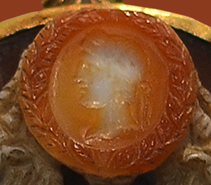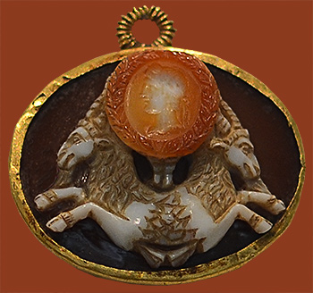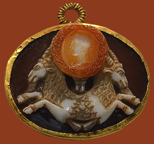 portrait of Augustus wearing a laurel-leaf crown is suspended between the horns of two goats, representing the constellation Capricorn. The cameo is set as a medallion with an ancient gold mounting. Capricorn was the emperor's favorite astrological sign, frequently depicted on