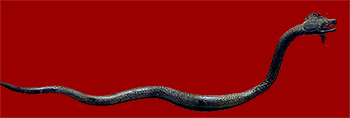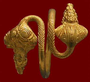 This remarkable bracelet, 610 grams (21.5 oz) of solid gold, is fashioned in the form of two snakes flanking