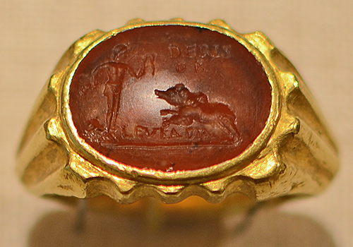 gold seal ring with carnelian intaglio, Roman, third century CE