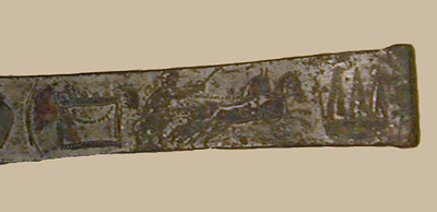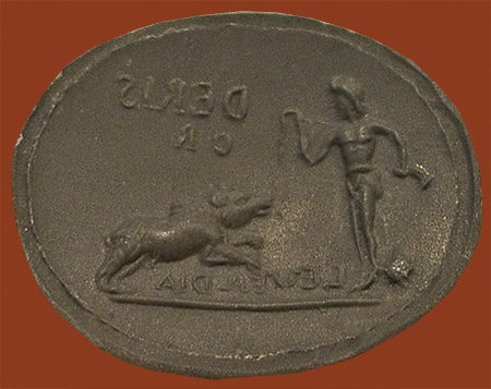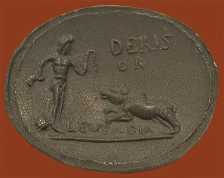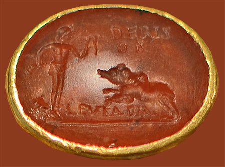 The carved stone on the ring depicts a man with a whip, probably a trainer, standing before a charging bear; inscribed are two names, DERISOR and LEVCADIA. The scene is clearer on the