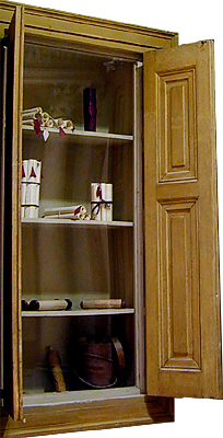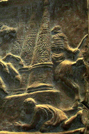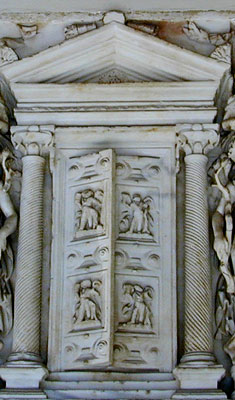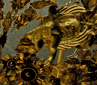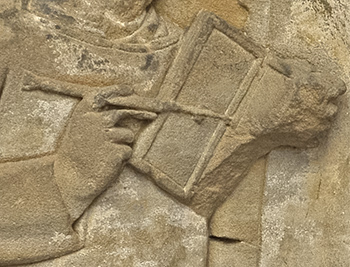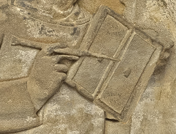 These small raised panels are symmetrically arranged, and their imagery dialogues with that of the body of