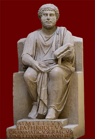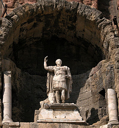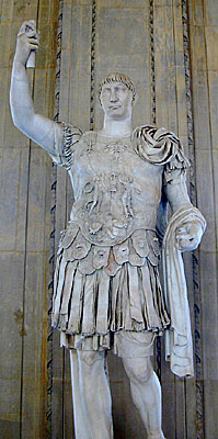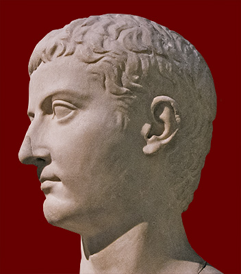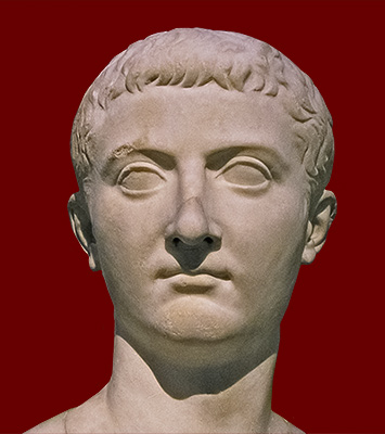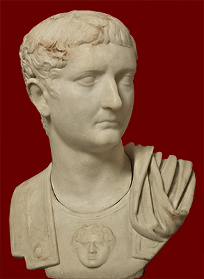 In this youthful idealized portrait, found with the bust of Livia shown above, Tiberius wears a military cloak and a cuirass with a Medusa head.