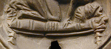 The sarcophagus imitates a oval vat for treading grapes to make wine (lenos) with rounded sides and two large
