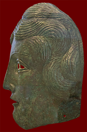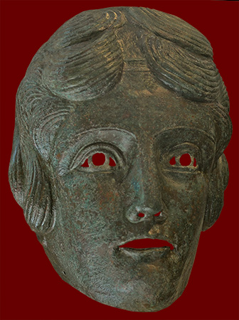These masks were worn by auxiliary cavalrymen during processions; there were holes on the side for fastening the masks with leather thongs. This mask depicts a female whose long hair is tied with a diadem, partly visible on her forehead; she may represent an Amazon.