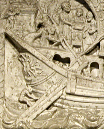 Unusally, the back of this sarcophagus is also carved, though in lower relief and with less detail. The scene