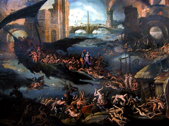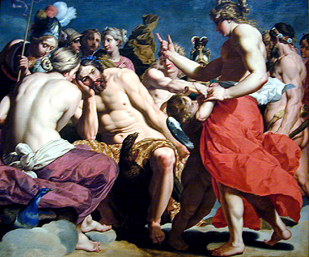 sister Aurora (Eos, Dawn) holds her horses, whose hooves trample a reclining grain-crowned female with snake, representing the earth.