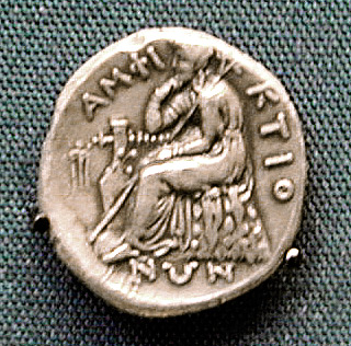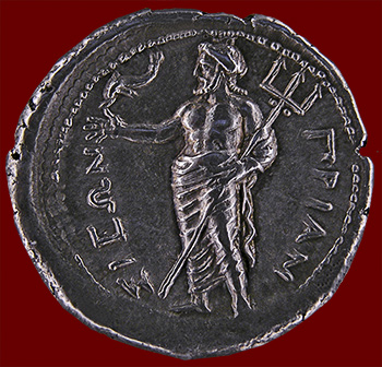 The reverse of this coin depicts the bearded sea-god Poseidon standing and holding a trident in his left hand; his right hand is outstretched toward a leaping dolphin.
