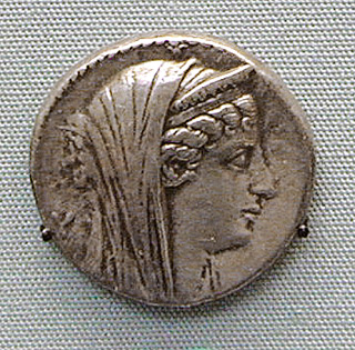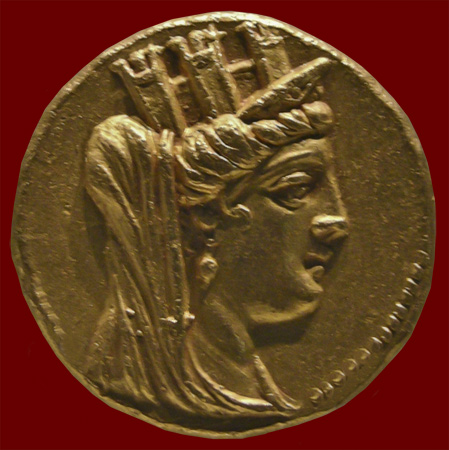 The obverse of this coin shows the head of the goddess Tyche wearing a veil (stephane) and a mural crown (depicting the walls of a city).