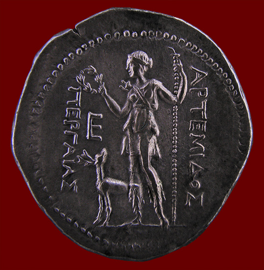 The reverse of this coin shows Artemis standing next to a stag that looks up to the goddess. She holds a wreath in her right hand and a spear in her left. She wears a diadem and is garbed as a huntress, with a bow and quiver on her shoulder and high, shaggy boots.