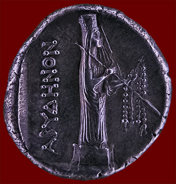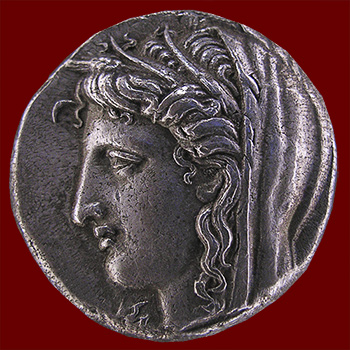 The obverse of this coin depicts the head of Demeter wearing a diadem and veil (stephane).