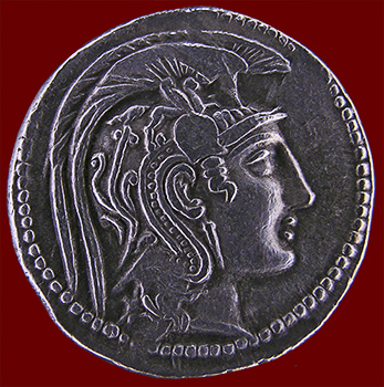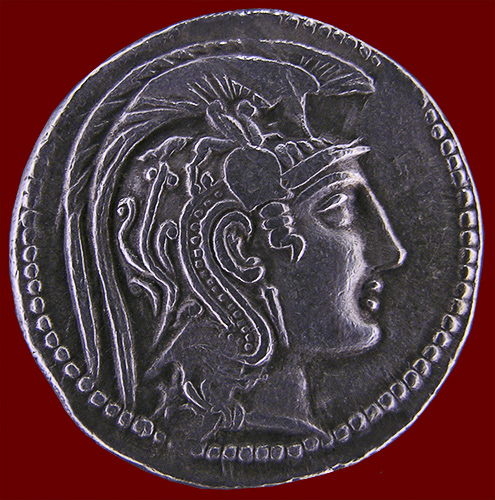 The obverse of this coin depicts a bust of Athena wearing an elaborate helmet with a crest and griffins; the design is based on the famous statue of Athena Parthenos by Phidias.