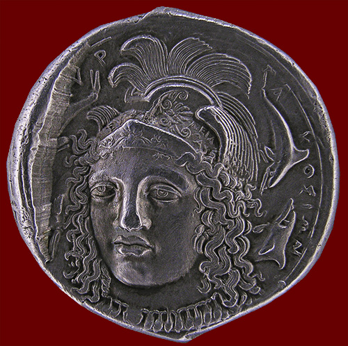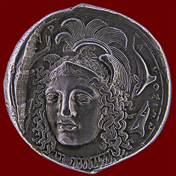 The obverse of this coin depicts the head of Athena facing front. The goddess wears an elaborate helmet and necklace; she is flanked by leaping dolphins, symbolic of Syracuse.