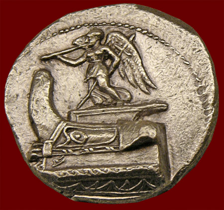 Demetrios, called Poliorketes ("the Beseiger"), commemorated his numerous naval victories with a series of these coins, in which a winged Nike stands on a ship's prow blowing a trumpet and holding a stylis (the cross-arm of a ship's mast) in her left arm.