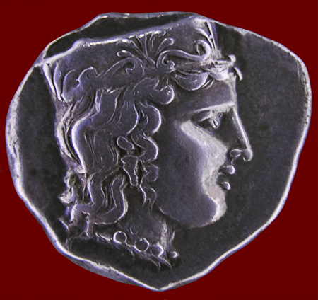 The obverse of this coin depicts the head of Apollo. The god wears a laurel wreath on his long flowing hair, and a bow and quiver can be see at his shoulder.