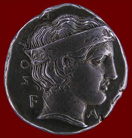 head of Zeus; the Greek letters FALEION refer to the city of Elis, which