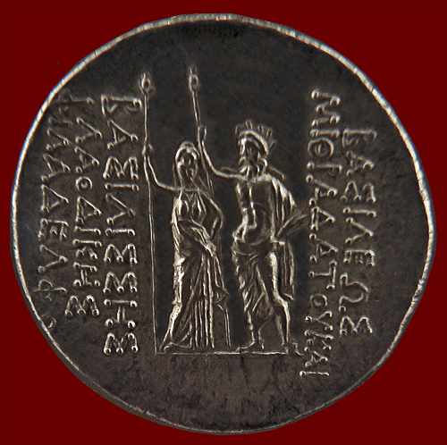 The reverse of this coin depicts Zeus, bearded, sitting on a throne; he holds a long scepter in his left hand while an eagle sits on his right hand stretched out over a leaping dolphin.