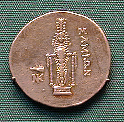 Dating from the period after the conquest of Pergamon by Alexander the Great, this coin depicts an archaistic
