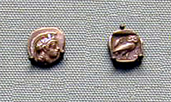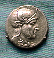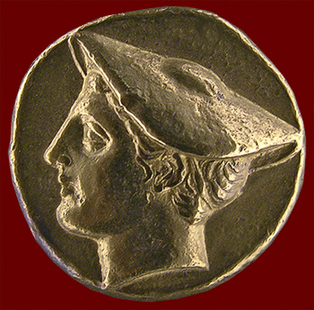 The obverse of this coin depicts the head of Hermes; the youthful god wears a traveler's cap (petasos).
