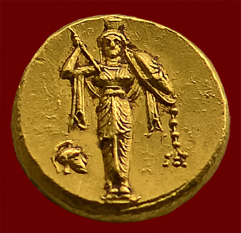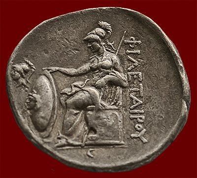 diademmed head of Seleukos I (an officer under Alexander the Great who later founded the Seleucid dynasty). The reverse depicts Athena seated on a throne; she holds a spear in her left arm and with her outstretched right hand balances a shield with a Medusa decoration. A helmeted head appears in front the shield and the name of Philetairos is inscribed behind the goddess.