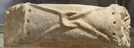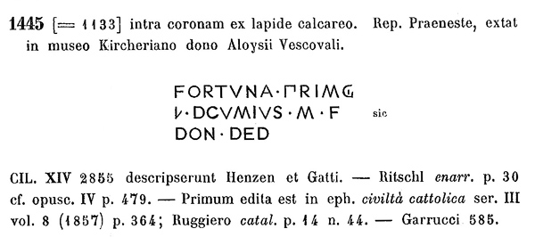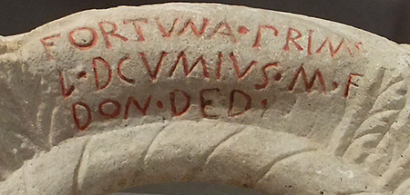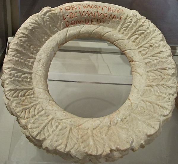 Votive gift (don ded) to Fortuna Primigenia dedicated by Lucius Decumius, son of Marcus (inscription). Decorated with floral motifs and acanthus leaves, this unique stone replica of actual wreaths was intended to stand vertically, with the Herakles knot visible on top. CIL I.1445. From Praeneste (Palestrina), where there was a huge sanctuary to the goddess. Early 2nd century BCE. Rome, Terme di Diocleziano. Credits: Ann Raia, 2009.