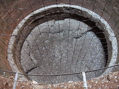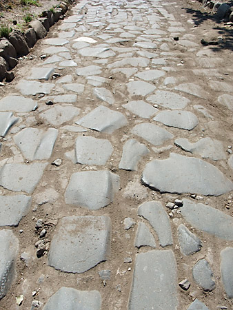 Ancient roadway beside the tombs (small); paving showing the wheel ruts in the tufa stones (detail).