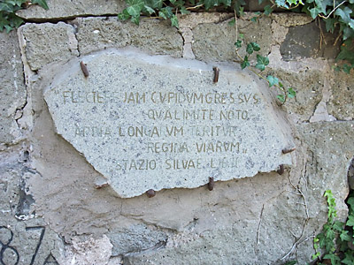APPIA LONGARVM TERITVR REGINA VIARVM ("now eager to turn my steps where the Appia, queen of the long roads, is worn away by a well-known track").
