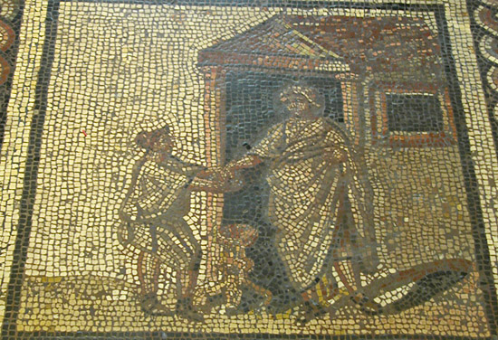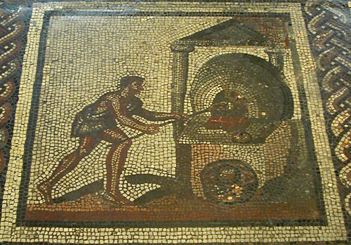 Scene from the Agricultural calendar of the Four Seasons: slave puts bread into an outdoor roofed oven. From the villa St. Roman en Gal, 3rd century CE.