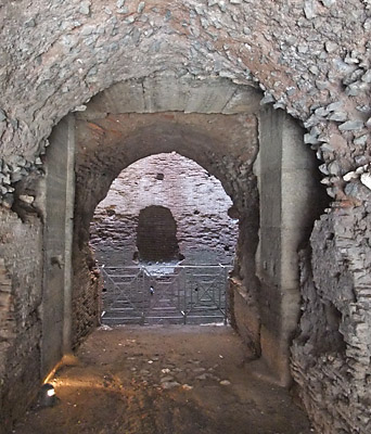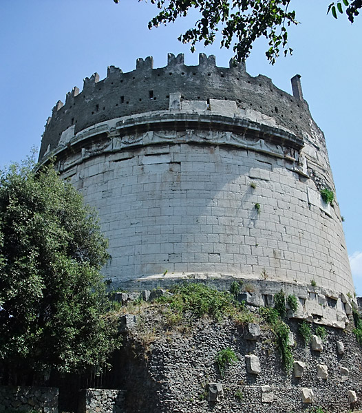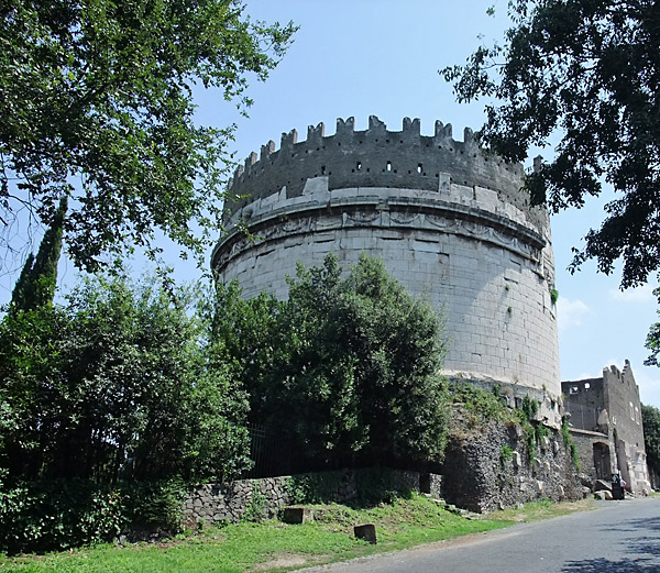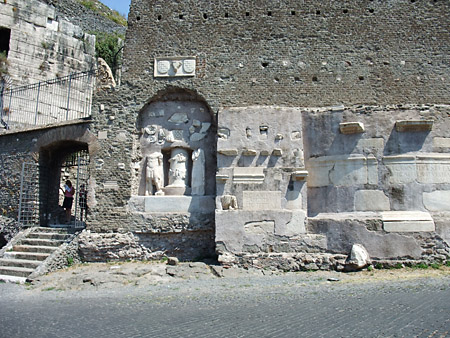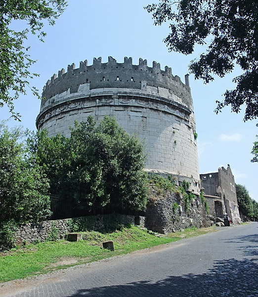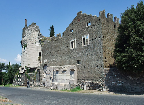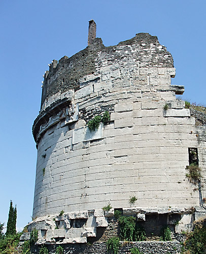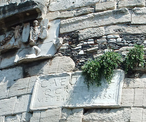 Monumental circular tomb decorated in the Augustan style with garlands and bull's heads, faced with marble. The massive tower is 100 Roman feet in diameter, 11 meters high, on a square base 7 meters high. The tomb was built by her husband and inscribed: CAECILIAE/Q[uinti] CRETICI F[iliae]/METELLAE CRASSI (For Caecilia Metella, daughter of Quintus Creticus, wife of Crassus). A corridor leads to the central brick-walled burial chamber. In 1303 it became a crenellated watchtower for the huge Caetani castle, the remains of which have been turned into a museum; on its face are ancient sculptural fragments and the 3rd milestone. Rome, Via Appia Antica at the 3rd milestone. End of the Republican period. Credits: Ann Raia, 2009.