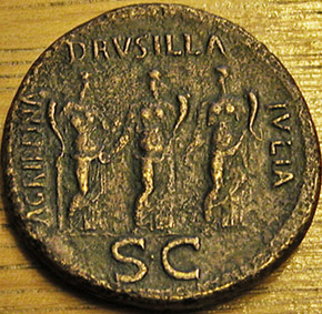 Inscribed with the names and images of his three sisters (Agrippina II, Drusilla, Julia); each holds a cornucopia and appears in the guise of a goddess: Drusilla also holds a patera and Julia holds a rudder. Below them the letters S[enatus] C[onsulto] (voted by decree of the Senate) are written. Minted in Rome, 37-38 CE. Museum of Cultural History, University of Oslo. Credits: Ann Raia, 2009.