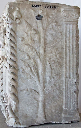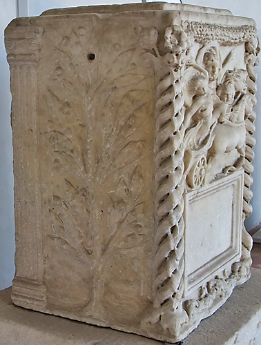 Opulent ossuary cippus with a frontal relief of the Rape of Persephone. Side 1: fruit tree with an Ionic pilaster to the right; Side 2: fruit tree with an Ionic pilaster to the left. Uninscribed. 4th century CE. Rome, Terme di Diocleziano. Credits: Ann Raia, 2009.
