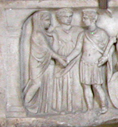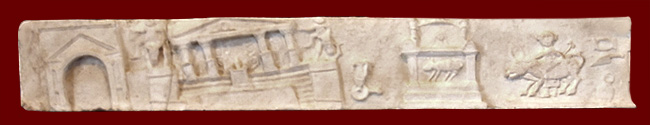 set up by her former owner and husband. Inscription: D[is] M[anibus]/ DASVMIAE SOTERIDI LI/BERTAE OPTIMAE ET CON/IVGI SANCTISSIMAE BENE/MER[enti] FEC[it] L[ucius] DASVMIVS CAL/LISTVS CVM QVA VIX[it] AN[nis]/ XXXV SINE VLLA QVE/RELLA OPTANS VT IPSA/ SIBI POTIVS SVPERSTES FV/ISSET QVAM SE SIBI SVPER/STITEM RELIQVISSET. The upper figured relief is broken off, leaving 2 pairs of feet; space left at the bottom was probably for his epitaph. Rome, 2nd century CE. London: British Museum. Credits: Ann Raia, 2008.