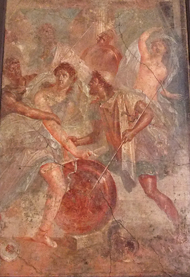 of Achilles dressed as a woman in Skyros; Odysseus tricks him into revealing himself when he is attracted to the gifts of armor. From the House of the Dioscouri, Pompeii. 1st century CE. Naples, Archaeological Museum. Credits: Ann Raia, 2009.
