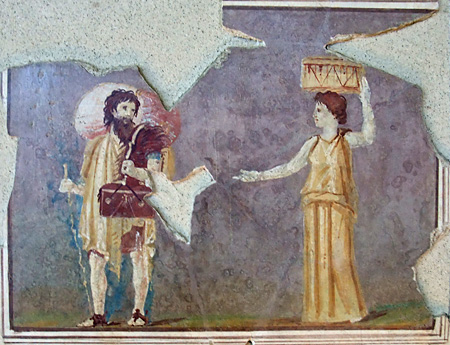 A man with a beard and hair untrimmed and a sack on his shoulders, and a young woman with a rectangular basked on her head. From Hall C of the Villa Farnesina. Late Republic-Early Empire (2nd-3rd Pompeian Style). Rome, Museo Nazionale Romano. Credits: Ann Raia, 2009.