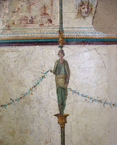This figure of a standing woman in Roman dress holding a continuous garland is one of the female vertical dividers along the long corridor frieze from the Villa Farnesina. Late Republic-Early Empire (2nd-3rd Pompeian Style). Rome, Museo Nazionale Romano. Credits: Ann Raia, 2009.