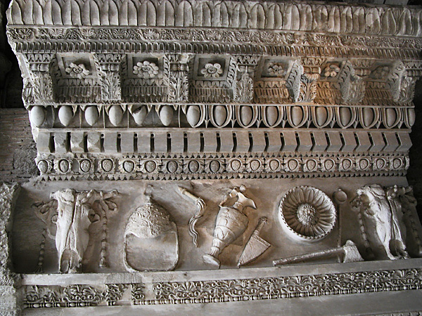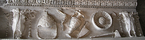 From the elegantly carved cornice of the Temple of Vespasian, dedicated by Domitian. Detail shows the sacrificial instruments of dedication (patera, ritual axe, knife, jug, aspersory, priestly helmet) between garlanded boucrania. 80-87 CE. Rome, Capitoline Museums: Tabularium. Credits: Ann Raia, 2007