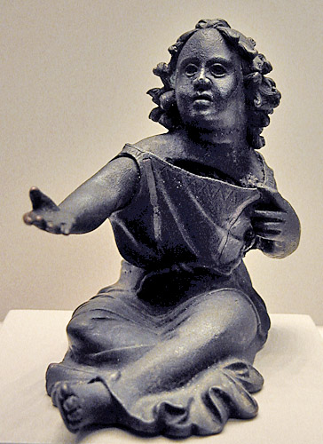 Shaped like a girl with curley hair, seated, with her right hand outstretched and her left hand holding open the top of her tunic where the money slot is. The upper edge of her tunic has incised decorations as well as two strips of copper trim. 25-50 CE. Getty Villa. Credits: Ann Raia, 2006, 2009.
