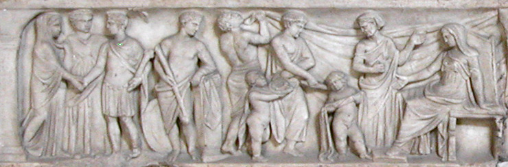 Child's sarcophagus with lid; frontal relief of children collecting nuts: the girls on the left (note draped background) in long dresses with melon hairstyles cooperate, while the boys on the right side fight (note how the umbo of the toga is used as a pocket). 3rd century CE. Rome, Vatican museum (Chiaramonte). Credits: Ann Raia, 2007.