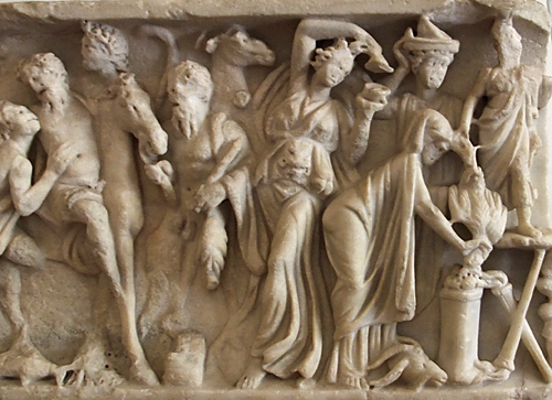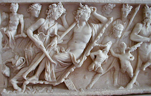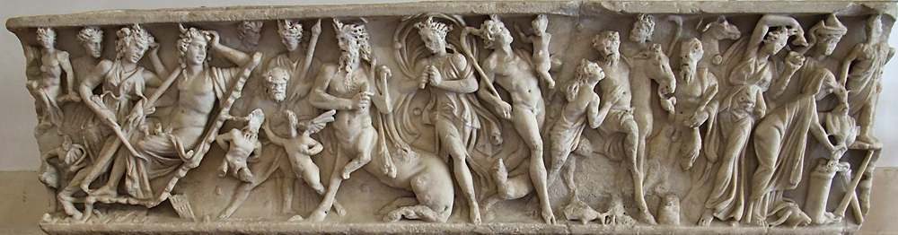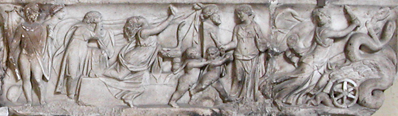Relief of a Dionysiac celebration curves around the sides; left front depicts Ariadne and Dionysus; on the right a veiled woman sacrifices a fowl. 3rd century CE. Rome, Terme di Diocleziano. Credits: Ann Raia, 2004, 2009.
