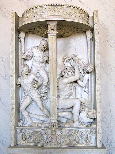 The story of Medea is carved in continuous frieze on this tablet (probably funerary): the left side shows her marriage, then Medea gives her children gifts for Creusa; the right side shows Creusa fleeing in torment, Medea about to kill her children and mounting her dragon chariot. Rome, Vatican museum (Chiaramonte). Credits: Ann Raia, 2007.