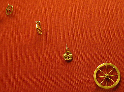 associated with the sun and worship and iconic images of the indigenous Gallic god Taranus, a cruel god of thunder who may have received human sacrifice. Some bear additional symbols and some seem to have been worn as jewelry. Gallo-Roman period (1-4th century CE).