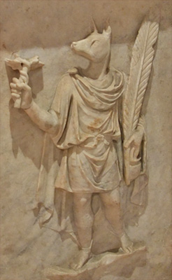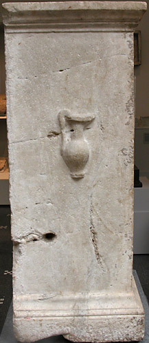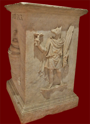 Carved on the front is the cista mystica, a woven wicker basket used for housing the sacred snake; side 2: Anubis, apparently in Roman dress, holds the feather of Maat in his left hand and a flail or fetish in his right hand (detail); side 3: an unclothed acolyte/eunuch holds a cornucopia. 1st half 1st century CE. From Santa Maria Sopra Minerva. Rome Capitoline Museums. Credits: Ann Raia, 2009.
