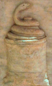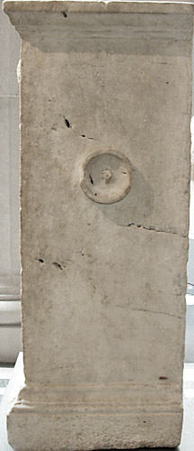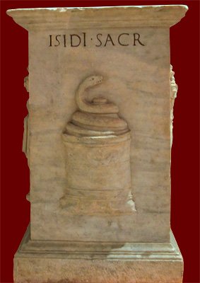 Erected by her husband C. Iulius Hermes for his wife, a priestess of Isis. On the front is a relief portrait of Isis/priestess holding a situla and sistrum; inscription: Dis Manibvs/ Cantineae M[arci] F[iliae] Proclae C[aius]/ Ivlivs Hermes conivgi pientiss[imae]/ bene merenti fecit; left side with image of closed cista mystica enveloped by a cobra; angle view; right side with image of open cista mystica guarded by a serpent. Flavian period (69-96 CE). CIL 6.34776. Rome, Via Ostia. Museo Terme di Diocleziano. Credits: Ann Raia, 2009.