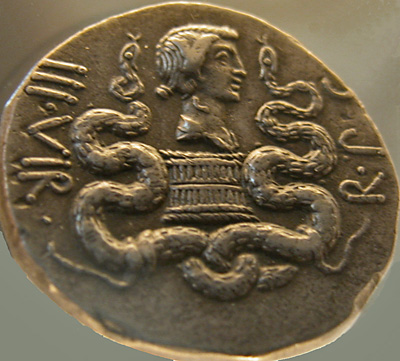 Obverse: head of Antony wearing ivy wreath, in the image of Bacchus, with a lituus below. Encircled by M[arcus] ANTONIVS IMP[erator] CO[n]S[ul] DESIC[gnatus] ITER[um] ET TERT[ium]; the whole within wreath of ivy leaves and berries. Reverse: Cista mystica between two interlaced serpents with draped bust of Octavia above. IIIVIR on left, R P C on right (IIIVIR Rei Publicae Constituendae = 2nd Triumvirate). Struck in Asia in 39 BCE. From Bibliotheque Nationale. Cluny Exhibit. Credits: Ann Raia, 2009.
