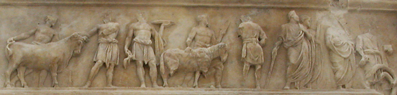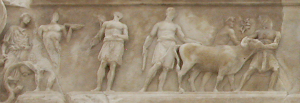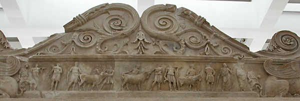 Outer side of the inner altar showing the sacrificial animals being led to the altar (details of end and beginningof the procession. 13 BCE. Rome. Credits: Ann Raia, 2007.