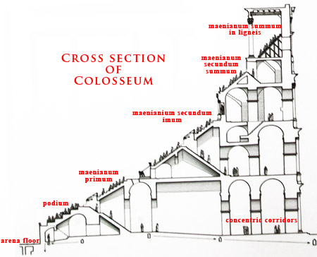 drawing of cross-section of Colosseum cavea, modern, with seating areas labeled