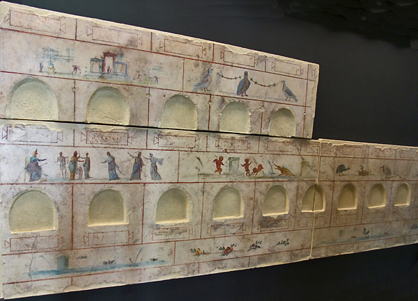 Arched niches for the cinerary urns of the dead; below each opening is a tabula ansata, a placard for the name of the deceased. The bands separating the rows are painted with images from life and nature (closeup; detail from a different section). Villa Doria Panfilji. Rome, 1 century CE. Credits: Ann Raia, 2009.