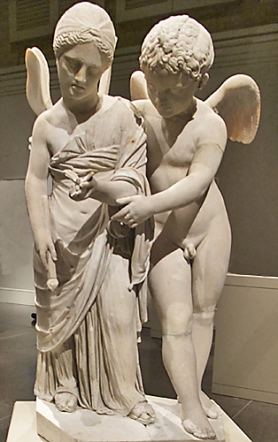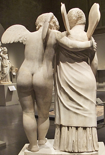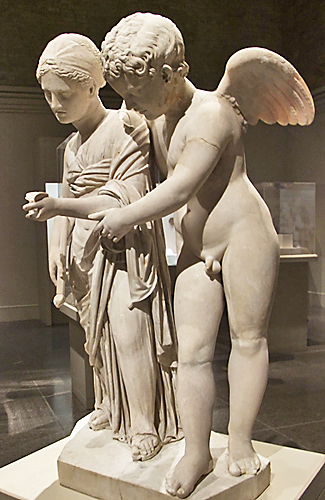Cupid and Psyche: marble life-size sculpture A draped Psyche wearing a snood holds a candle and a butterfly which a childlike Cupid observes (side view); the back view) displays his embrace and their different wing shapes. From Hadrian's villa in Tivoli, 117-138 CE.