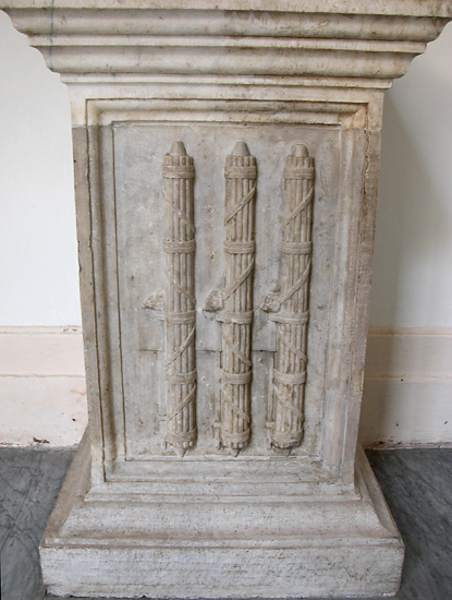 Sole carving on a funerary altar, they are a symbol of punishment (rods bundled with an ax) meted out by magistrates with imperium (praetor, dictator, consul) and carried by lictors. Rome, Capitoline Museums. Credits: Ann Raia, 2009.