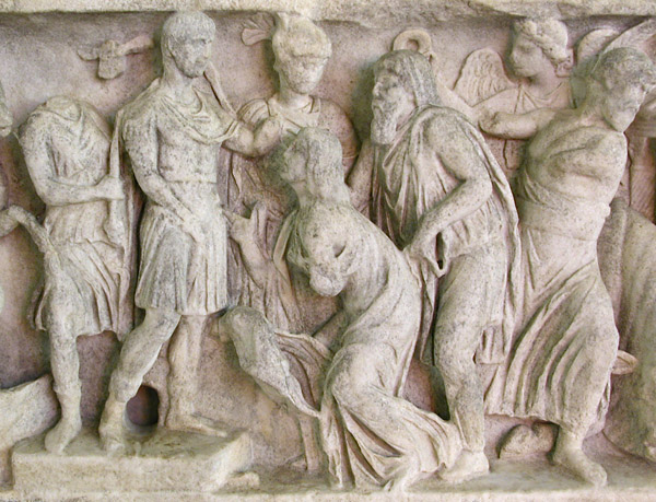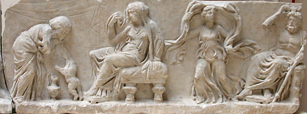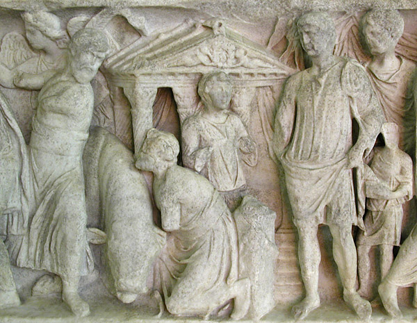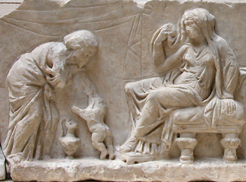 Detail of the nurse bathing the child. The relief frieze on the front of this biographical sarcophagus contains (left to right) scenes from the life of the deceased (who looks Trajanic): pacification, administration of the defeated, sacrifice before a temple, marriage before a pronuba. Rome, 160-180 CE.